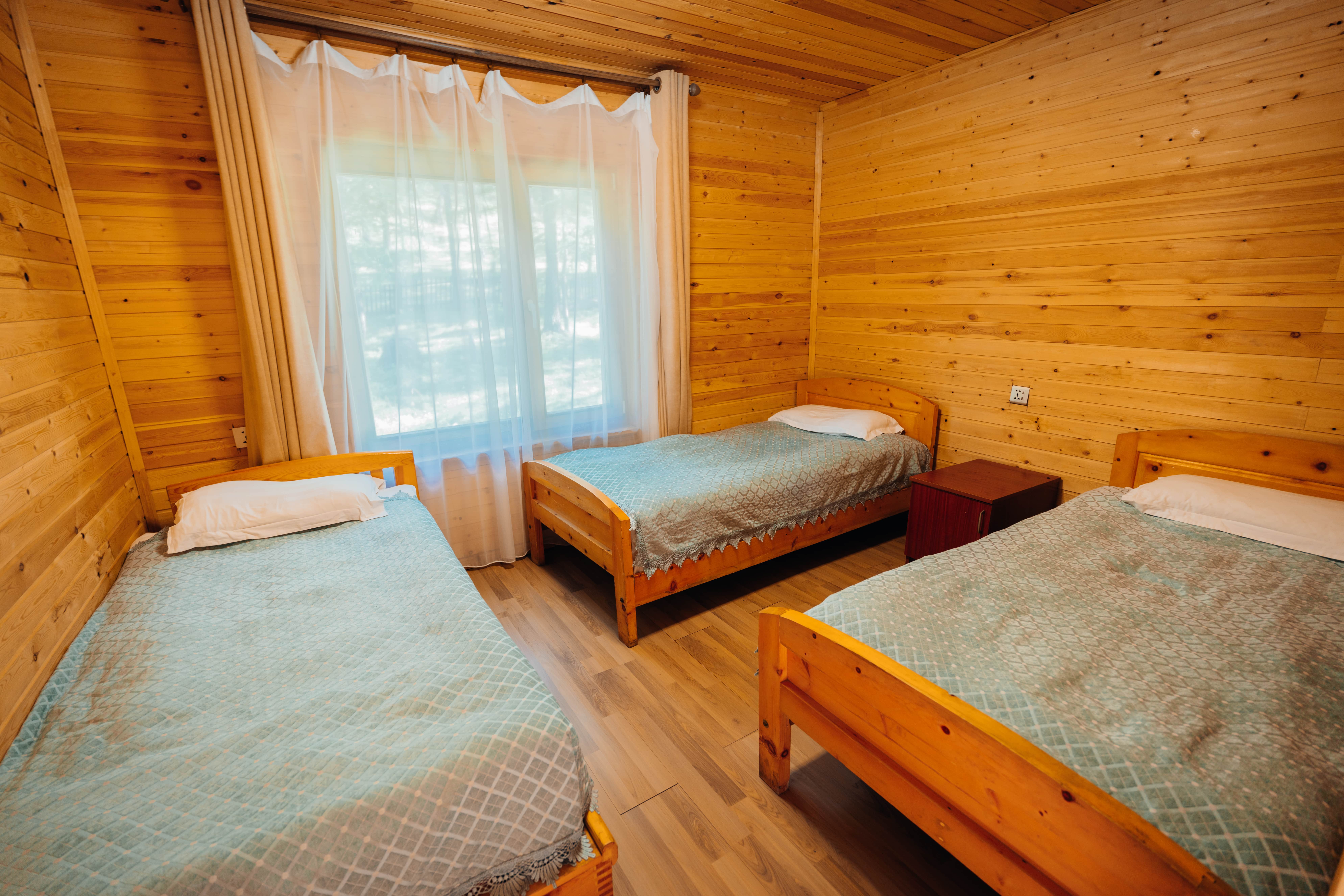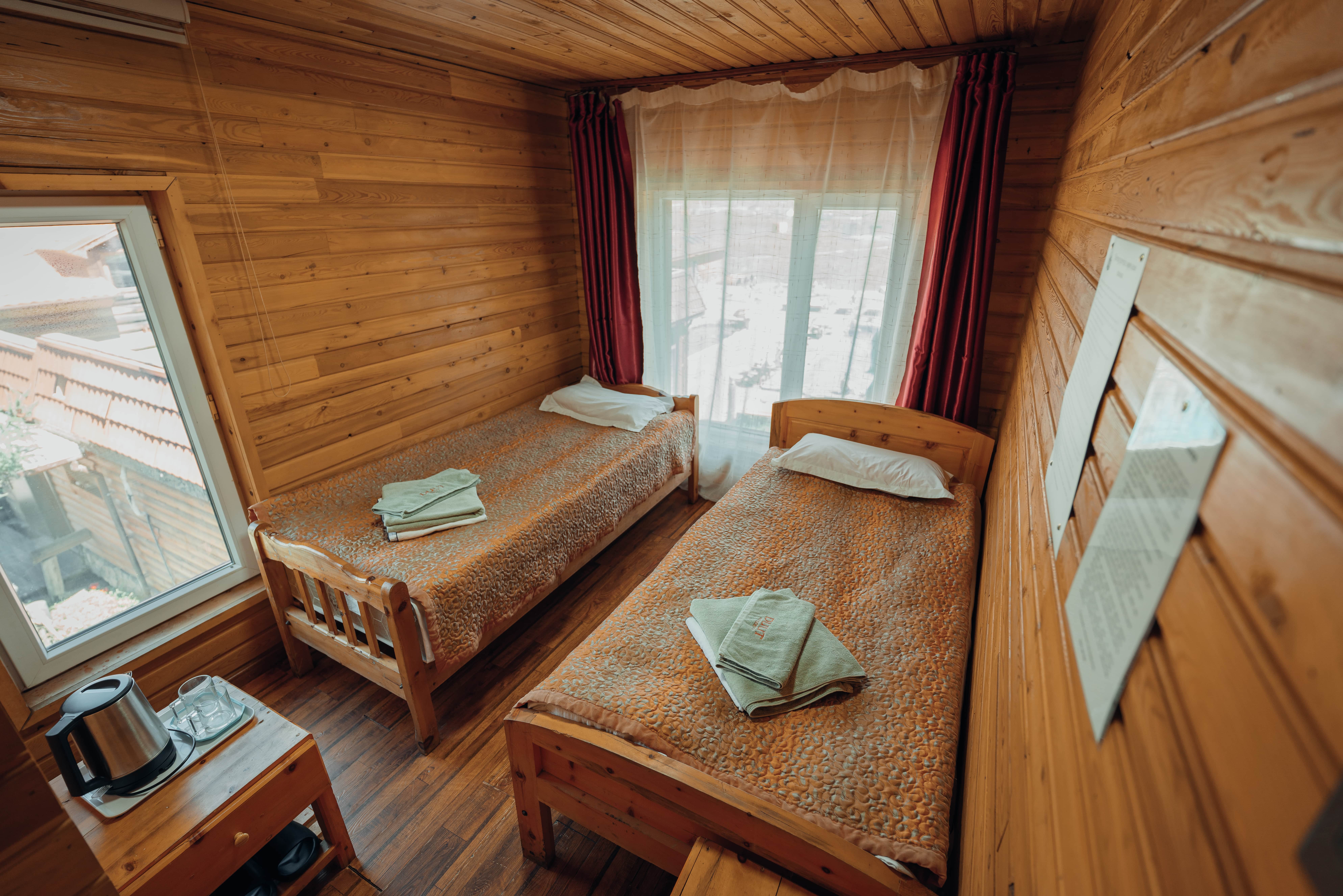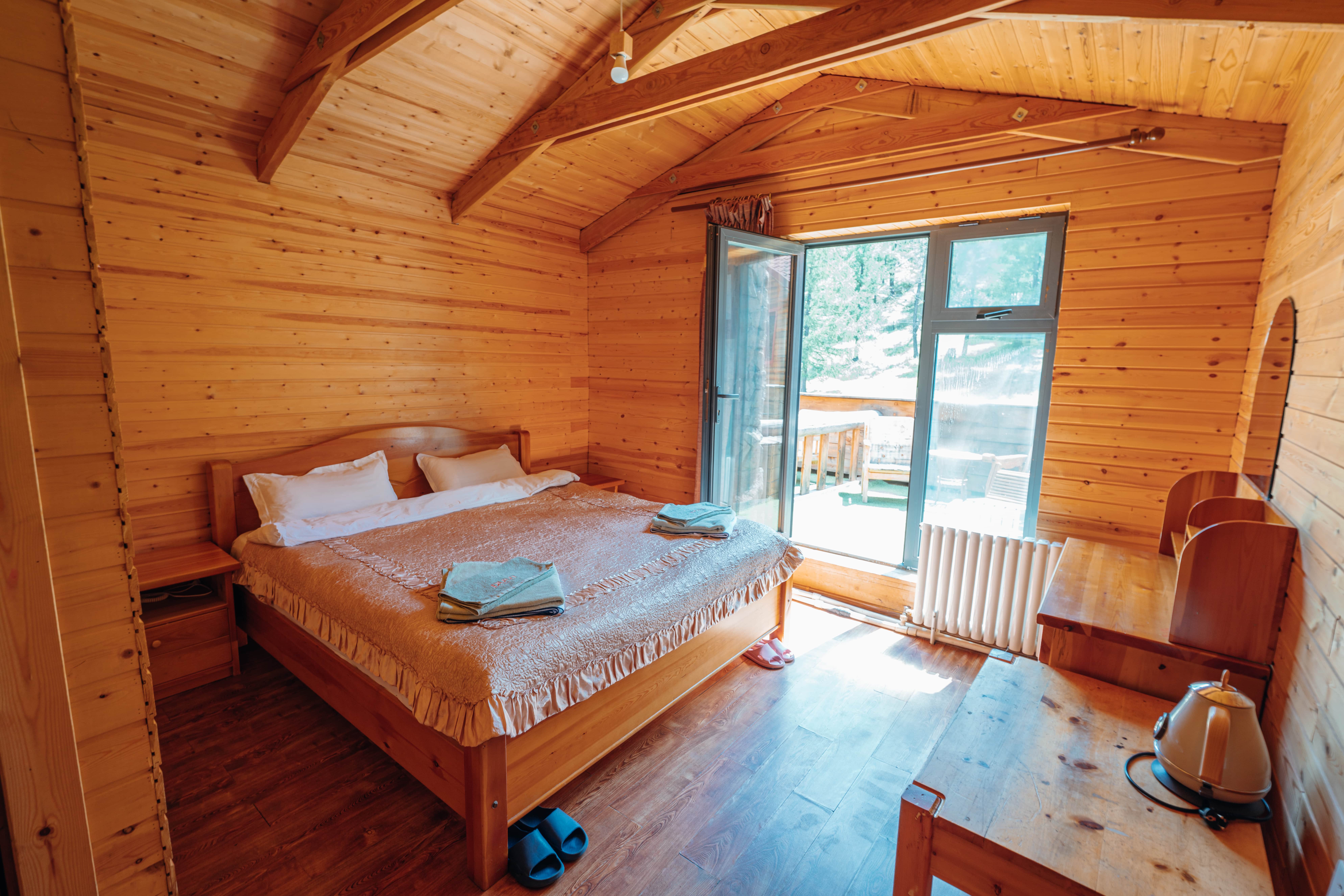 A simple and budget-friendly wooden cabin, ideal for a short overnight stay. It fits 2 people with two single beds, basic amenities, and a small terrace area — perfect for resting in nature without the extras.